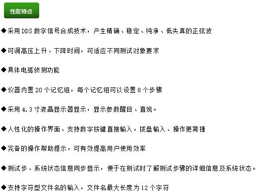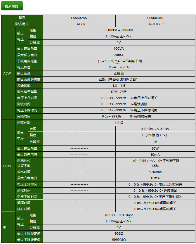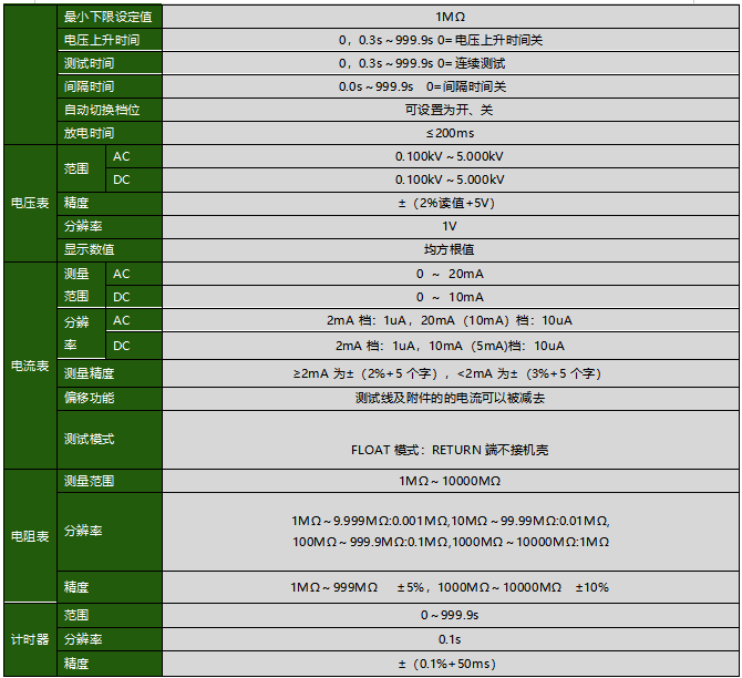 自動絕緣/耐壓測試儀,耐壓電壓0.10~5.00kV(AC) /0.100~5.00kV(DC)、漏電流范圍0.100~20.00mA(AC)/0.100~10.00mA(DC),絕緣電阻測試電壓100V/250V/500V/1000V、電阻范圍1~9999MΩ,耐壓測量精度±(2%+2個字),絕緣電阻測量精度±(5%+2個字)。
